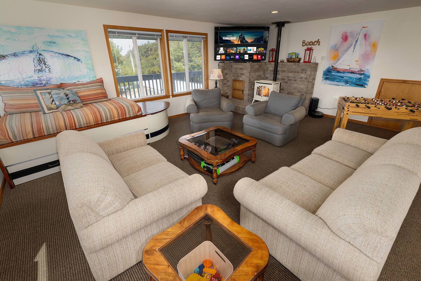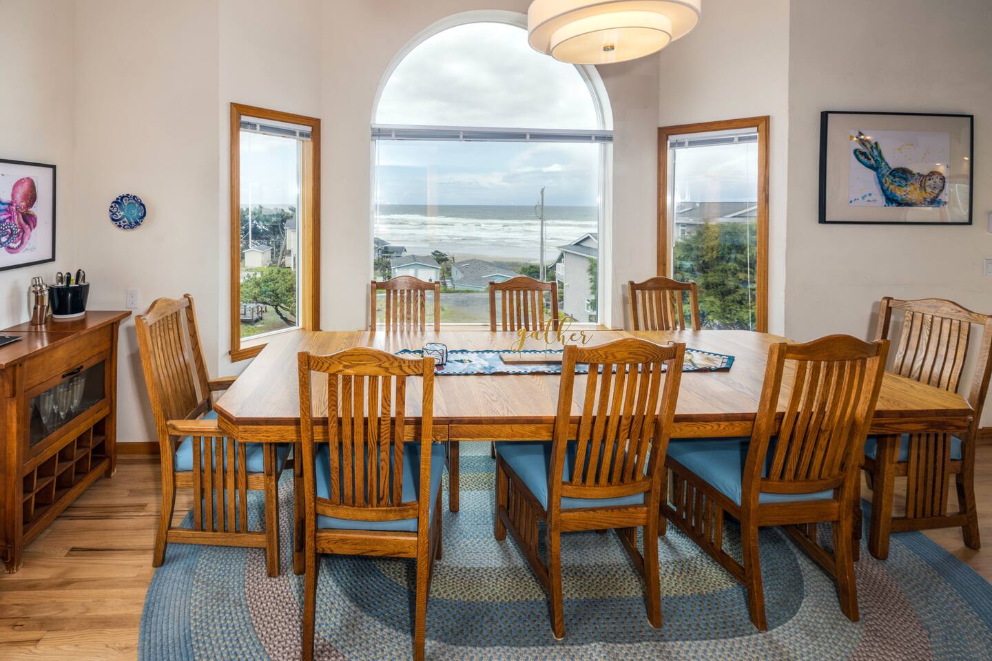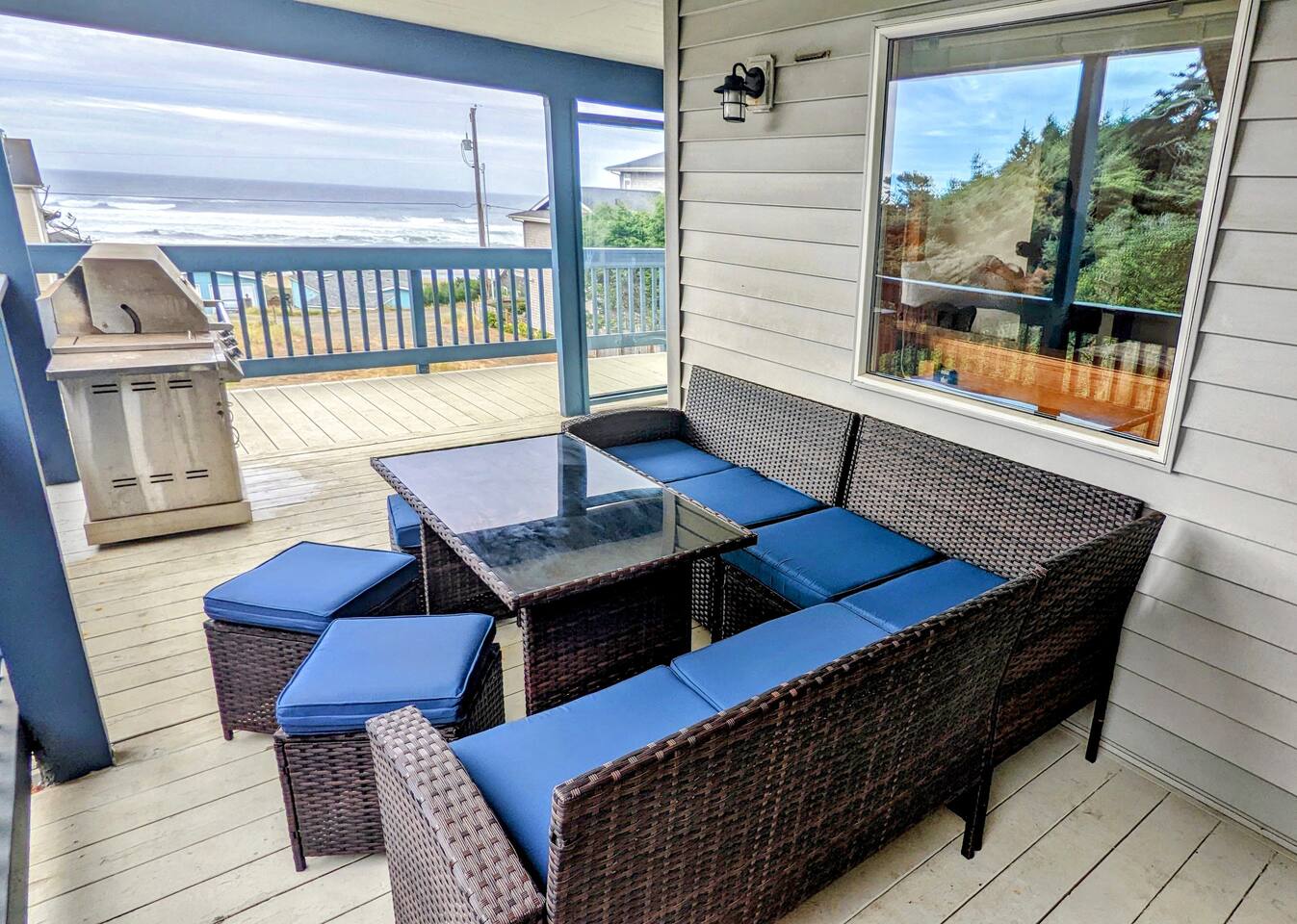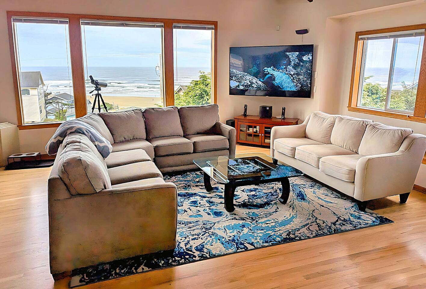 While most places in the area you'll need to be on a deck to enjoy whale watching, at Seascape you can cozy up by the warm fire and watch the waves and sunset on the plentiful couches or at the large dinner table. Not to be outdone, Seascape has an amazing wrap-around deck, and covered porch, allowing our guests to enjoy every speck of our stunning views. Our covered porch, with outdoor seating, gives you the chance to eat al fresco on our lovely Oregon Coast days. The massive game room on the lower floor gives everyone a place to hang out and play with a huge supply of board games. While the third level and loft offers two beds spaced far enough apart they have tons of privacy, and perhaps some of the best views in the house. With three master suites all outfitted with King size beds, Seascape is perfect for multiple families and there is parking for six vehicles. On the main level, you’ll find a king bed master suite with a large bathroom where our breathtaking views can be seen from a jetted bathtub, there is also a shower in this bathroom. You'll find the kitchen/dining/main living area on this level. Downstairs you'll find two more masters with king beds, one with an additional full bathroom and one with a half bath. On this level you will also find our rec. room/kids’ suite, four single beds make up this space, from the rec. room you have access to the deck (you can also reach the deck from the main steps to the house. All bathrooms open to both the adjoined bedroom and the common area. Our third floor is our loft bedroom with two queen beds, at over 400 square feet the loft allows both beds to have ample privacy. The large chef’s kitchen offers marble counters and top of the line stainless appliances, VitaMix blender, Keurig coffee brewer, regular coffee pot, waffle iron, crockpot, instant pot, air fryer, Kitchenaid mixer, bread machine and instant hot water tap, as well as plenty of cabinet space for all your groceries. This is a kitchen ready to cook fantastic meals (or unpackaged take out from local restaurants, no judgement we do both). The dining table has 12 chairs. In addition, the large island has barstool seating for 4. Both the living rooms and rec/slumber party room have large comfortable couches with enough space for everyone in the house. The main level has a 75-inch Smart-tv, rec room has a 70-inch Smart-TV Each bedroom has a TV. Part of our massive deck is covered, with a table that seats 6 as well as a large propane BBQ for all your grilling needs.