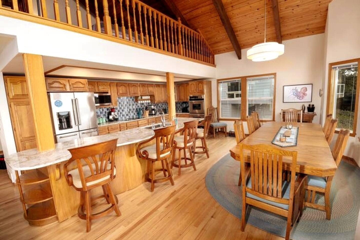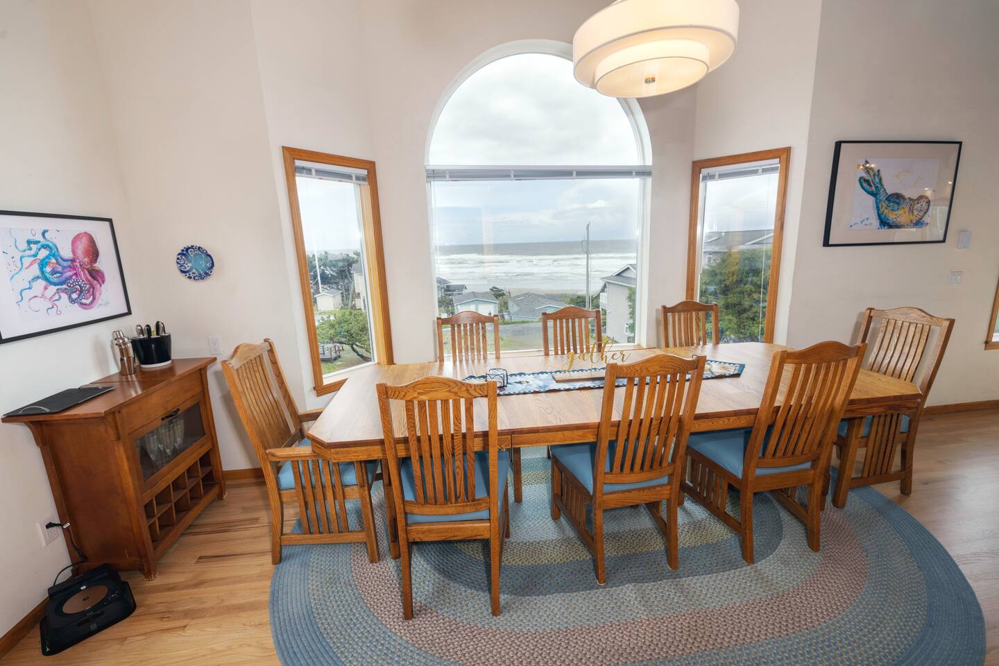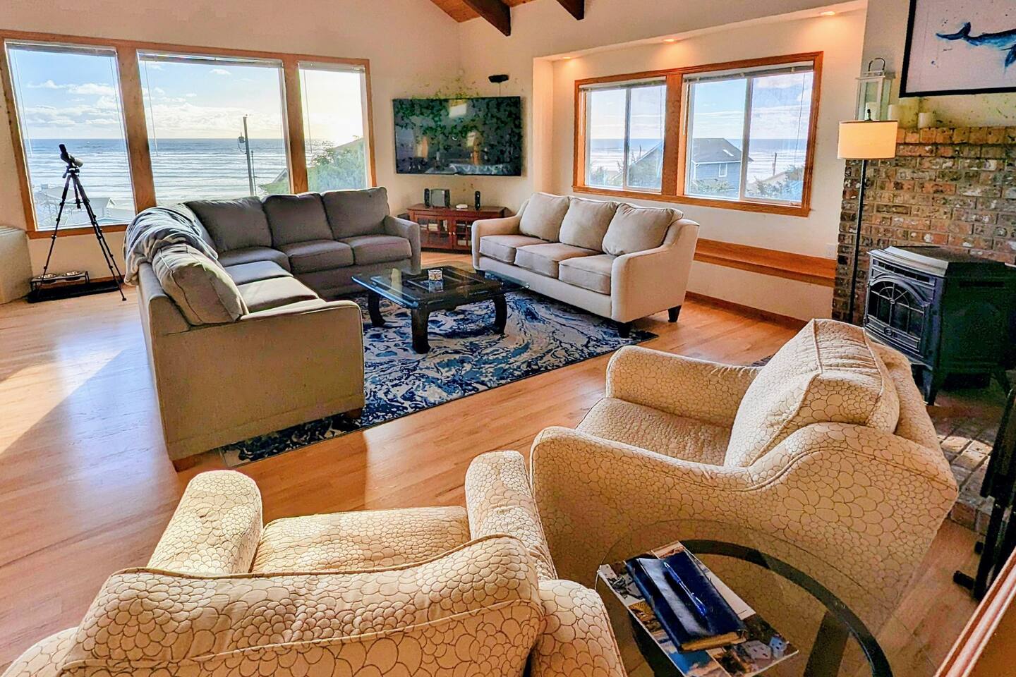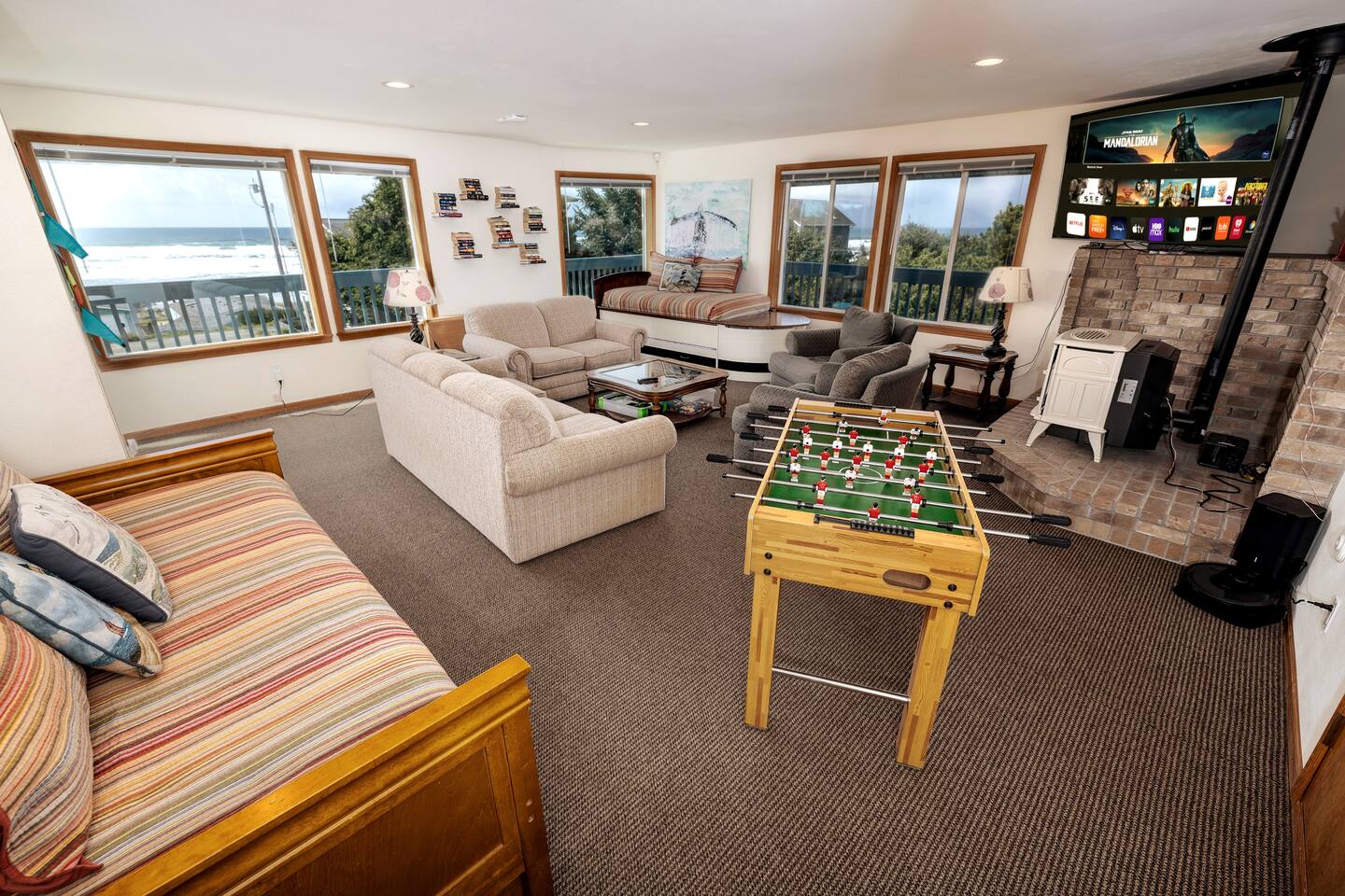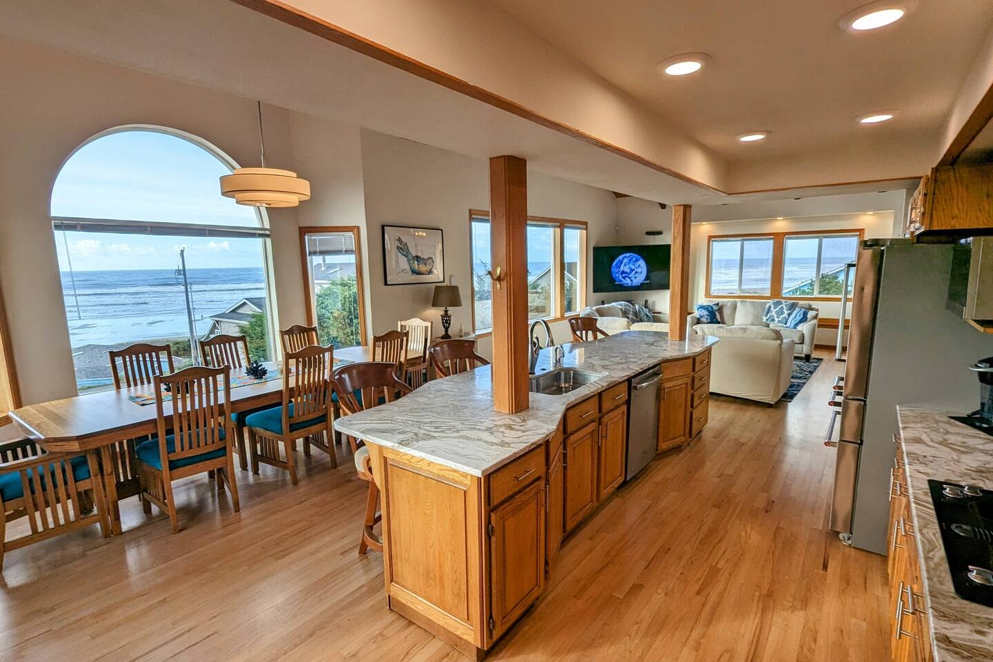 While most places in the area you'll need to be on a deck to enjoy whale watching, at Seascape you can cozy up by the warm fire and watch the waves and sunset on the plentiful couches or at the large dinner table. Not to be outdone, Seascape has an amazing wrap-around deck, and covered porch, allowing our guests to enjoy every speck of our stunning views. Our covered porch, with outdoor seating, gives you the chance to eat al fresco on our lovely Oregon Coast days. The massive game room on the lower floor gives everyone a place to hang out and play with a huge supply of board games. While the third level and loft offers two beds spaced far enough apart they have tons of privacy, and perhaps some of the best views in the house. With three master suites all outfitted with King size beds, Seascape is perfect for multiple families and there is parking for six vehicles. On the main level, you’ll find a king bed master suite with a large bathroom where our breathtaking views can be seen from a jetted bathtub, there is also a shower in this bathroom. You'll find the kitchen/dining/main living area on this level. Downstairs you'll find two more masters with king beds, one with an additional full bathroom and one with a half bath. On this level you will also find our rec. room/kids’ suite, four single beds make up this space, from the rec. room you have access to the deck (you can also reach the deck from the main steps to the house. All bathrooms open to both the adjoined bedroom and the common area. Our third floor is our loft bedroom with two queen beds, at over 400 square feet the loft allows both beds to have ample privacy. The large chef’s kitchen offers marble counters and top of the line stainless appliances, VitaMix blender, Keurig coffee brewer, regular coffee pot, waffle iron, crockpot, instant pot, air fryer, Kitchenaid mixer, bread machine and instant hot water tap, as well as plenty of cabinet space for all your groceries. This is a kitchen ready to cook fantastic meals (or unpackaged take out from local restaurants, no judgement we do both). The dining table has 12 chairs. In addition, the large island has barstool seating for 4. Both the living rooms and rec/slumber party room have large comfortable couches with enough space for everyone in the house. The main level has a 75-inch Smart-tv, rec room has a 70-inch Smart-TV Each bedroom has a TV. Part of our massive deck is covered, with a table that seats 6 as well as a large propane BBQ for all your grilling needs.