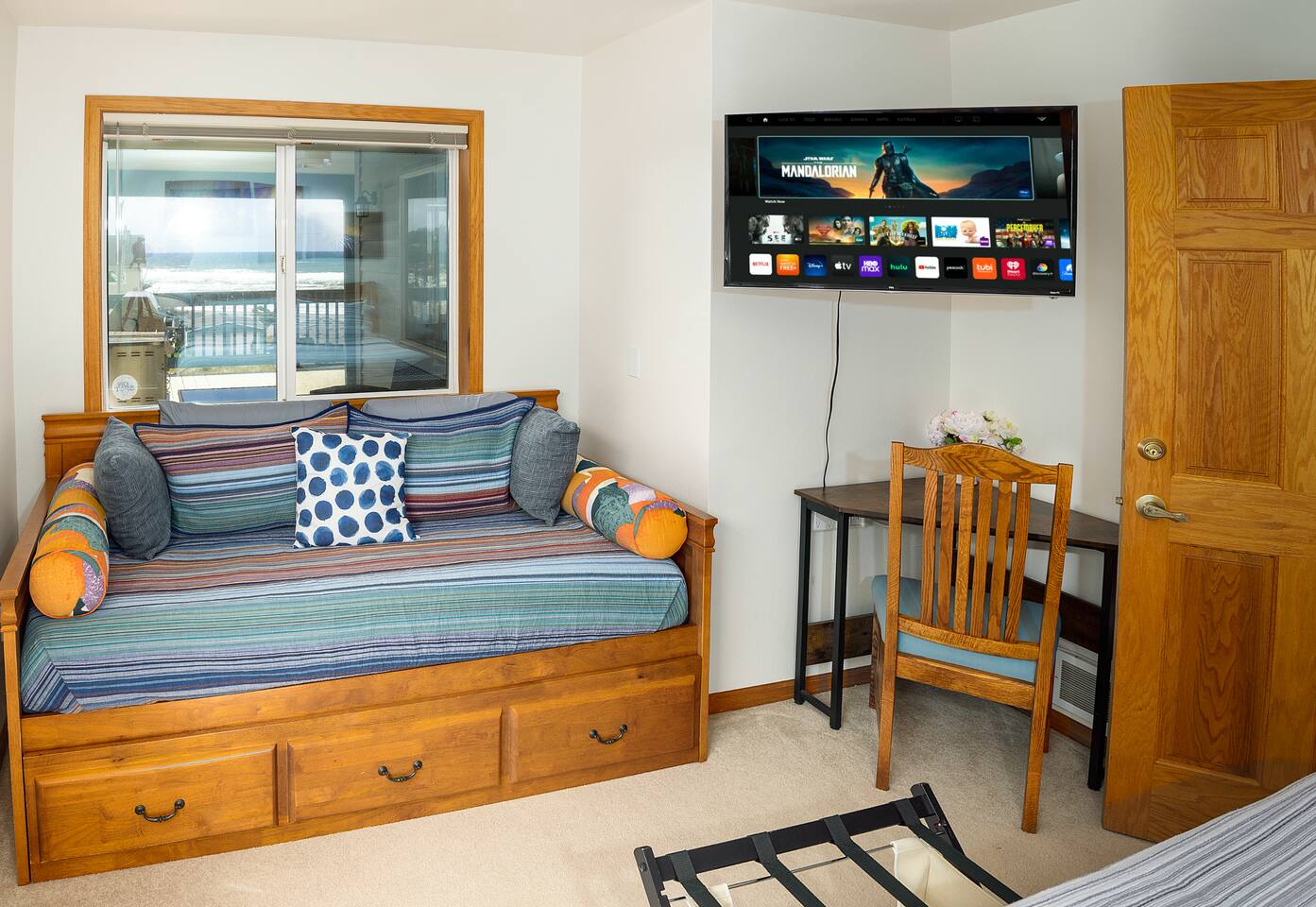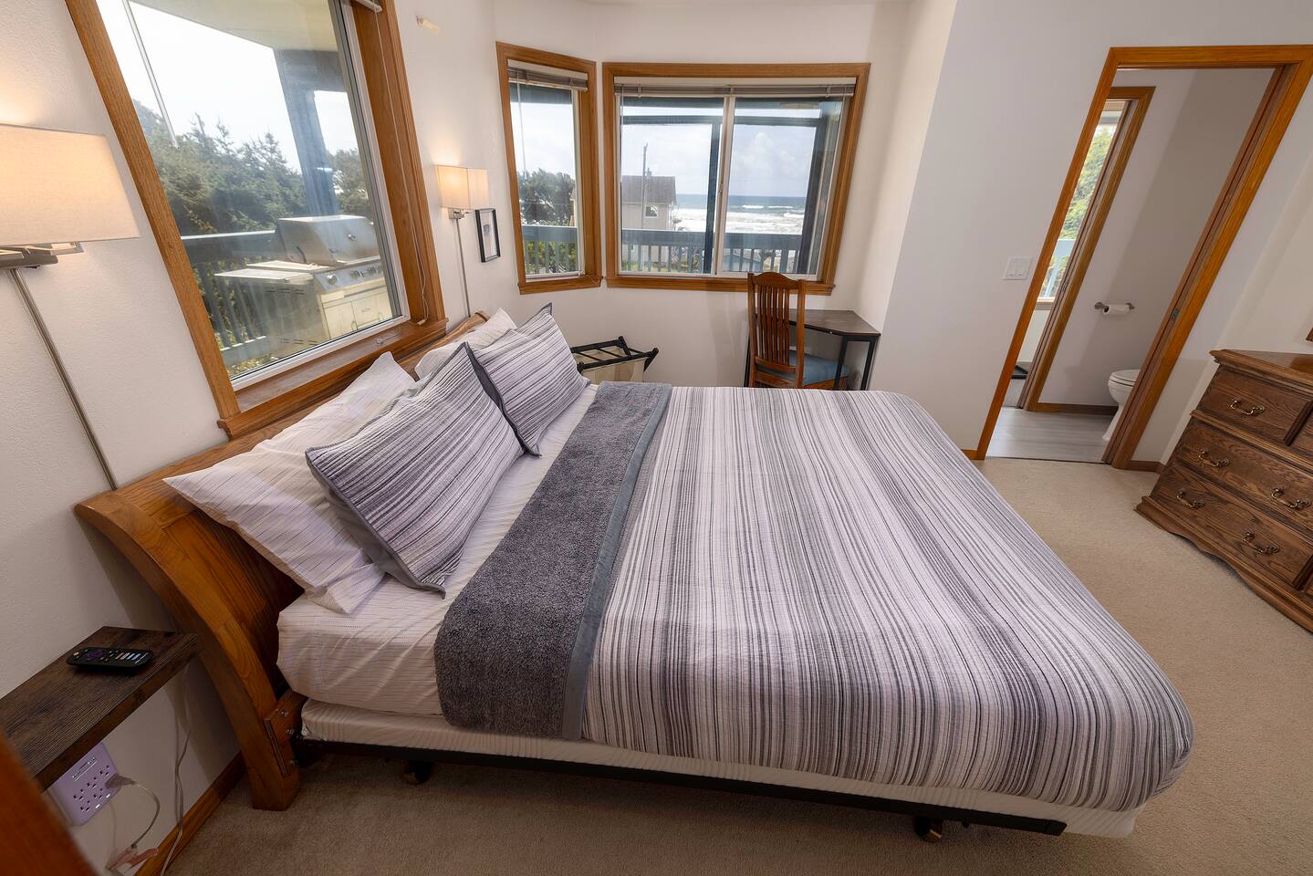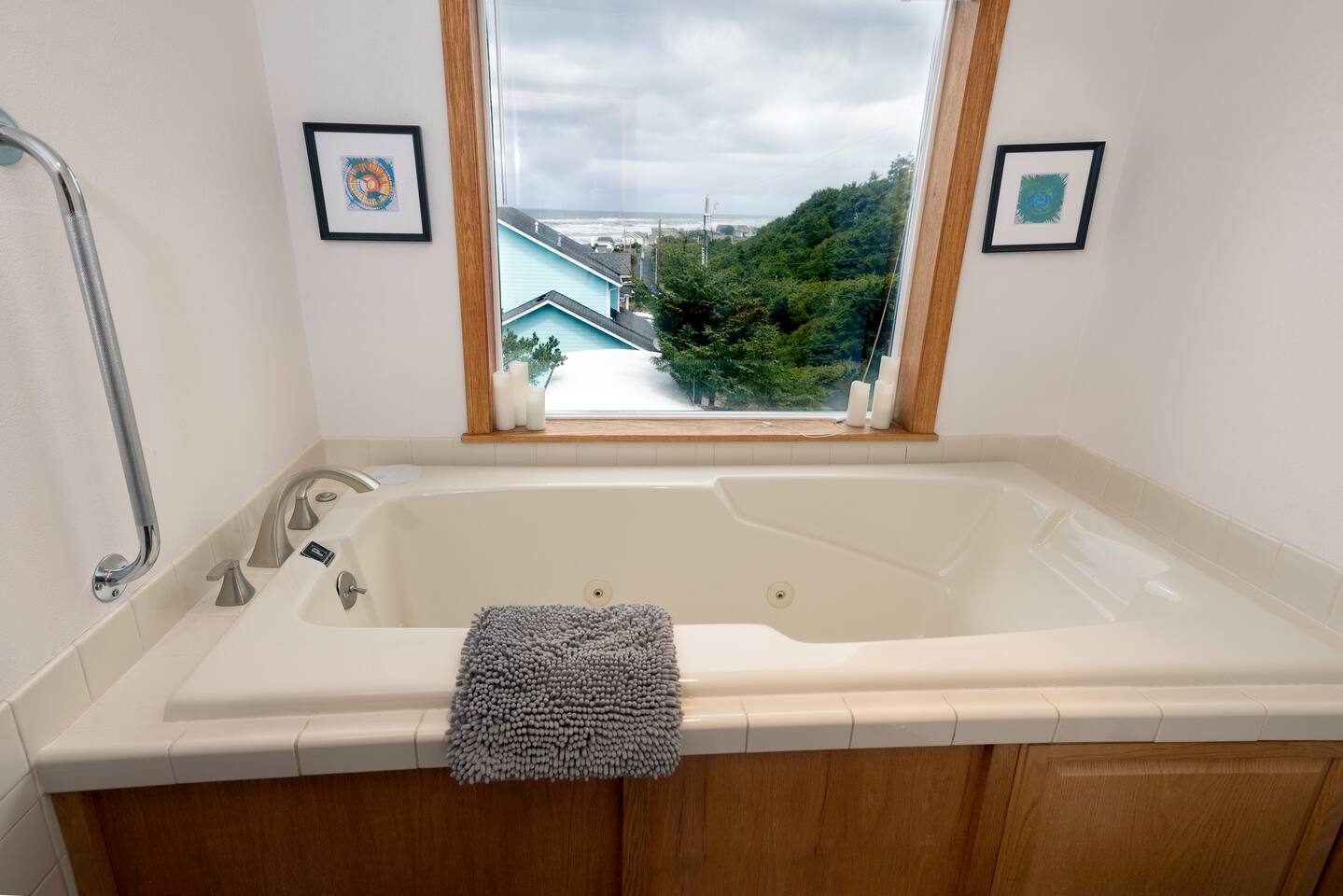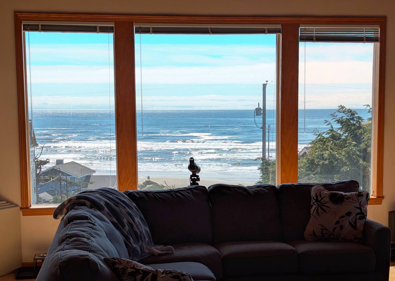 While most places in the area you'll need to be on a deck to enjoy whale watching, at Seascape you can cozy up by the warm fire and watch the waves and sunset on the plentiful couches or at the large dinner table. Not to be outdone, Seascape has an amazing wrap-around deck, and covered porch, allowing our guests to enjoy every speck of our stunning views. Our covered porch, with outdoor seating, gives you the chance to eat al fresco on our lovely Oregon Coast days. The massive game room on the lower floor gives everyone a place to hang out and play with a huge supply of board games. While the third level and loft offers two beds spaced far enough apart they have tons of privacy, and perhaps some of the best views in the house. With three master suites all outfitted with King size beds, Seascape is perfect for multiple families and there is parking for six vehicles. On the main level, you’ll find a king bed master suite with a large bathroom where our breathtaking views can be seen from a jetted bathtub, there is also a shower in this bathroom. You'll find the kitchen/dining/main living area on this level. Downstairs you'll find two more masters with king beds, one with an additional full bathroom and one with a half bath. On this level you will also find our rec. room/kids’ suite, four single beds make up this space, from the rec. room you have access to the deck (you can also reach the deck from the main steps to the house. All bathrooms open to both the adjoined bedroom and the common area. Our third floor is our loft bedroom with two queen beds, at over 400 square feet the loft allows both beds to have ample privacy. The large chef’s kitchen offers marble counters and top of the line stainless appliances, VitaMix blender, Keurig coffee brewer, regular coffee pot, waffle iron, crockpot, instant pot, air fryer, Kitchenaid mixer, bread machine and instant hot water tap, as well as plenty of cabinet space for all your groceries. This is a kitchen ready to cook fantastic meals (or unpackaged take out from local restaurants, no judgement we do both). The dining table has 12 chairs. In addition, the large island has barstool seating for 4. Both the living rooms and rec/slumber party room have large comfortable couches with enough space for everyone in the house. The main level has a 75-inch Smart-tv, rec room has a 70-inch Smart-TV Each bedroom has a TV. Part of our massive deck is covered, with a table that seats 6 as well as a large propane BBQ for all your grilling needs.