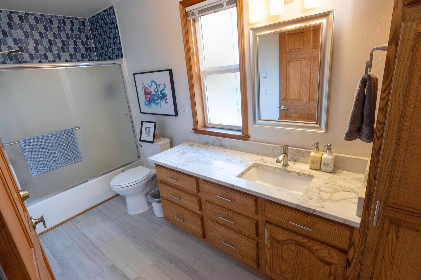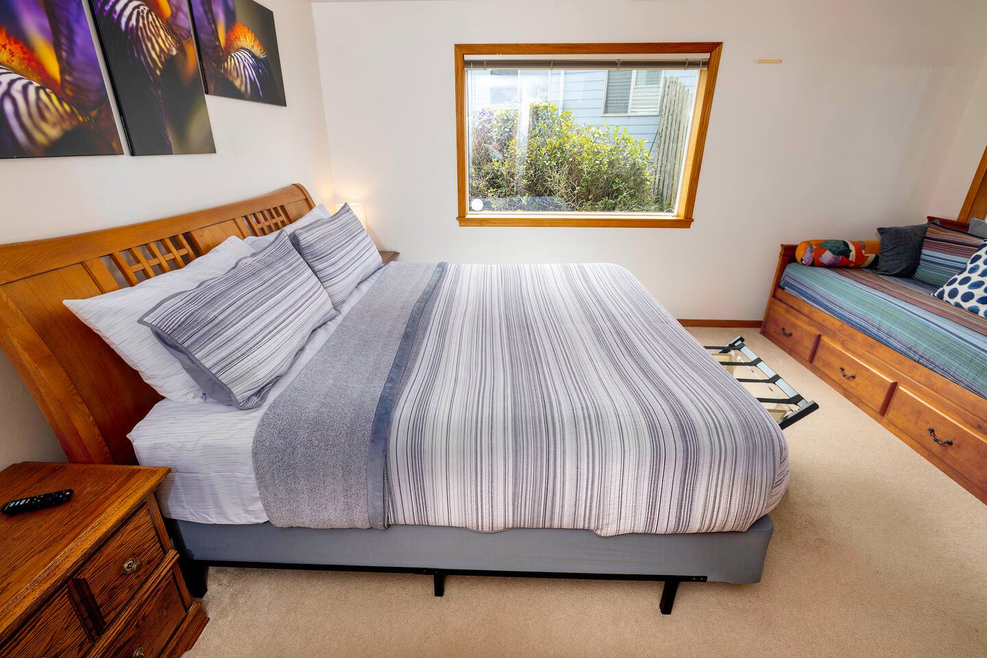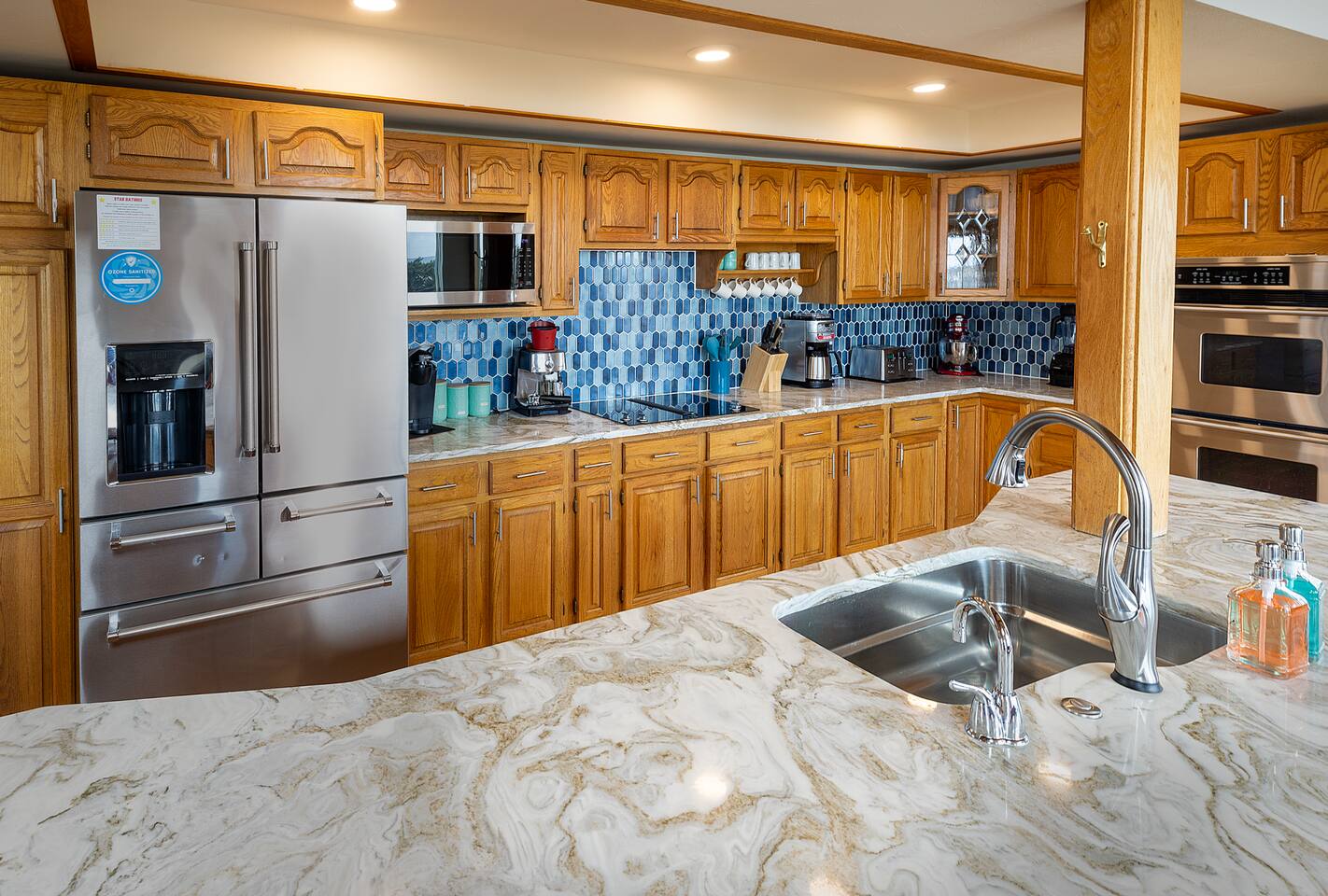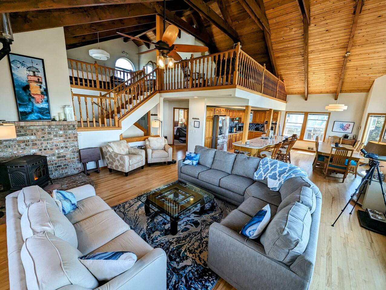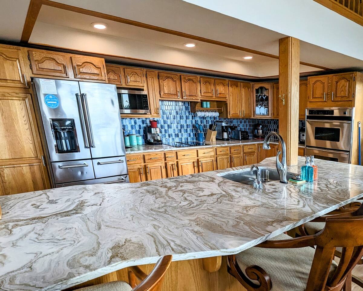 While most places in the area you'll need to be on a deck to enjoy whale watching, at Seascape you can cozy up by the warm fire and watch the waves and sunset on the plentiful couches or at the large dinner table. Not to be outdone, Seascape has an amazing wrap-around deck, and covered porch, allowing our guests to enjoy every speck of our stunning views. Our covered porch, with outdoor seating, gives you the chance to eat al fresco on our lovely Oregon Coast days. The massive game room on the lower floor gives everyone a place to hang out and play with a huge supply of board games. While the third level and loft offers two beds spaced far enough apart they have tons of privacy, and perhaps some of the best views in the house. With three master suites all outfitted with King size beds, Seascape is perfect for multiple families and there is parking for six vehicles. On the main level, you’ll find a king bed master suite with a large bathroom where our breathtaking views can be seen from a jetted bathtub, there is also a shower in this bathroom. You'll find the kitchen/dining/main living area on this level. Downstairs you'll find two more masters with king beds, one with an additional full bathroom and one with a half bath. On this level you will also find our rec. room/kids’ suite, four single beds make up this space, from the rec. room you have access to the deck (you can also reach the deck from the main steps to the house. All bathrooms open to both the adjoined bedroom and the common area. Our third floor is our loft bedroom with two queen beds, at over 400 square feet the loft allows both beds to have ample privacy. The large chef’s kitchen offers marble counters and top of the line stainless appliances, VitaMix blender, Keurig coffee brewer, regular coffee pot, waffle iron, crockpot, instant pot, air fryer, Kitchenaid mixer, bread machine and instant hot water tap, as well as plenty of cabinet space for all your groceries. This is a kitchen ready to cook fantastic meals (or unpackaged take out from local restaurants, no judgement we do both). The dining table has 12 chairs. In addition, the large island has barstool seating for 4. Both the living rooms and rec/slumber party room have large comfortable couches with enough space for everyone in the house. The main level has a 75-inch Smart-tv, rec room has a 70-inch Smart-TV Each bedroom has a TV. Part of our massive deck is covered, with a table that seats 6 as well as a large propane BBQ for all your grilling needs.